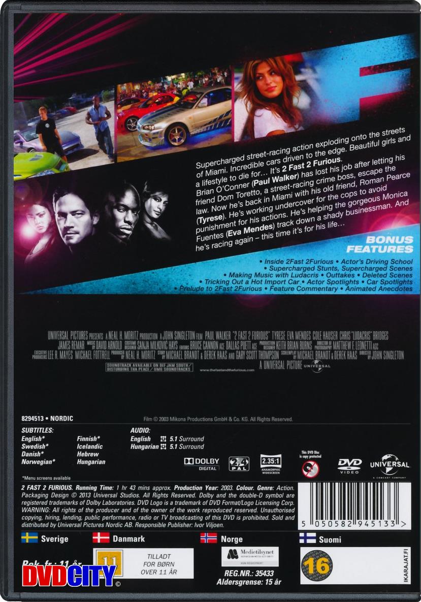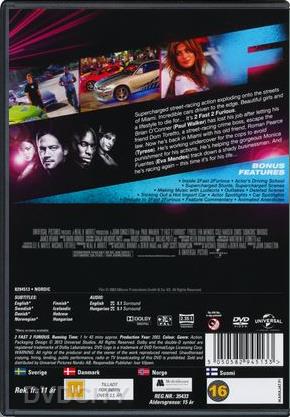 | Beskrivelse: [ Dansk Engelsk ] Hårdt-pumpende "streetracing" eksploderer i Miami's gader. Utrolige biler bliver presset til det yderste. Smukke piger og en livsstil, der er værd at dø for... Det er 2 Fast 2 Furious Den Oscar-nominerede instruktør, John Singleton, giver dig den adrenalin- og oktanpumpende opfølger til "The Fast and The Furious". Brian O'Conner har mistet sit job, efter at han har ladet sin ven, Dom Toretto, en "streetracende" forbryderchef, flygte fra lovens lange arm. Nu er han tilbage i Miami med sin gamle ven, Roman Pearce. Brian arbejder under dække for politiet for at undgå at blive straffet for sine handlinger. Han hjælper den pragtfulde Monica Fuentes med at finde en lyssky Miami forretningsmand. Og han kører "streetracing" igen - denne gang med livet som indsats... Beskrivelse: [ Dansk Engelsk ] Supercharged street-racing action exploding onto the streets of Miami. Incredible cars driven to the edge. Beautiful girls and a lifestyle to die for... It's 2 Fast, 2 Furious.