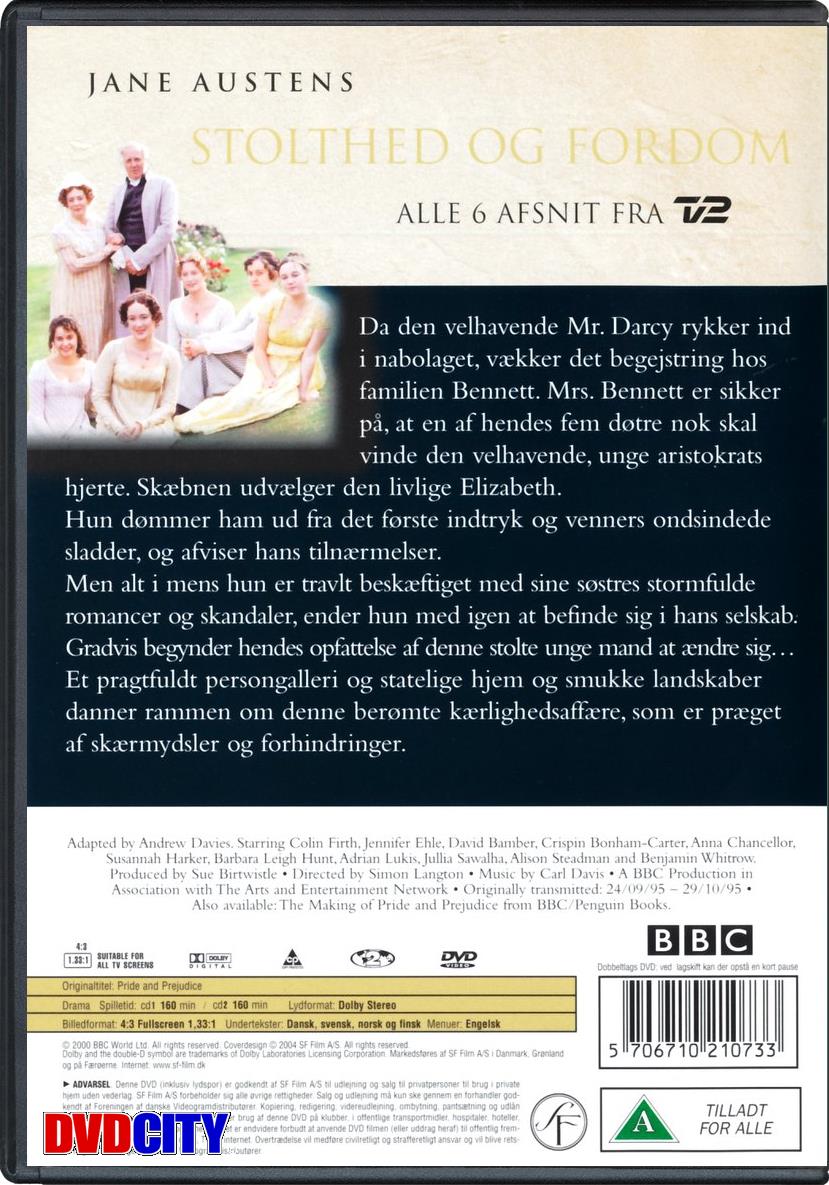 | Beskrivelse: [ Dansk Engelsk ] Det er en alment kendt sandhed, at en enlig, velhavende mand trænger til en hustru. Da den velhavende Mr. Darcy rykker ind i nabolaget, vækker det begejstring hos familien Bennett. Mrs. Bennett er sikker på, at en af hendes fem døtre nok skal vinde den velhavende, unge aristokrats hjerte. Skæbnen udvælger den livlige Elizabeth. Hun dømmer ham ud fra det første indtryk og venners ondsindede sladder, og afviser hans tilnærmelser. Men alt i mens hun er travlt beskæftiget med sine søstres stormfulde romancer og skandaler, ender hun med igen at befinde sig i hans selskab. Gradvis begynder hendes opfattelse af denne stolte unge mand at ændre sig... Et pragtfuldt persongalleri og statelige hjem og smukke landskaber danner rammen om denne berømte kærlighedsaffære, som er præget af skærmydsler og forhindringer.