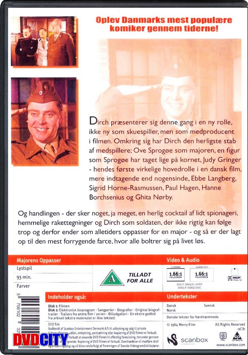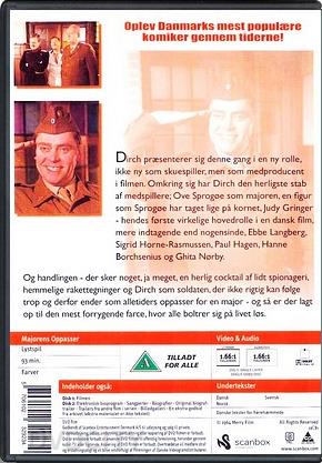 Dirch præsenterer sig denne gang i en ny rolle, ikke ny som skuespiller, men som medproducent i filmen. Omkring sig har Dirch den herligste stab af medspillere. Ove Sprogøe som majoren, en figur som Sprogøe har taget lige på kornet, Judy Gringer hendes første virkelige hovedrolle i en dansk film mere indtagende end nogensinde, Ebbe Langberg, Sigrid Horne Rasmussen, Poul Hagen og Ghita Nørby. | Ekstra features: